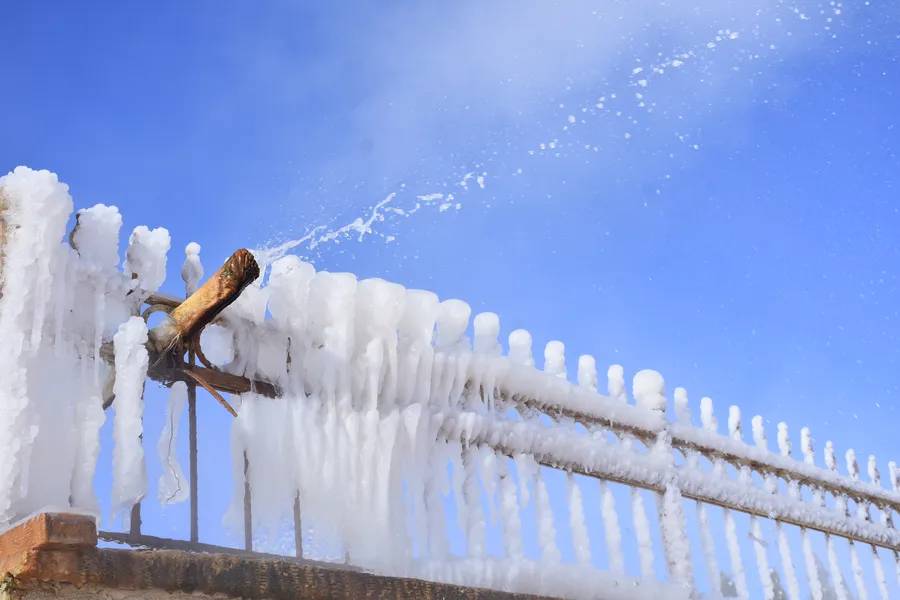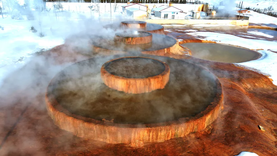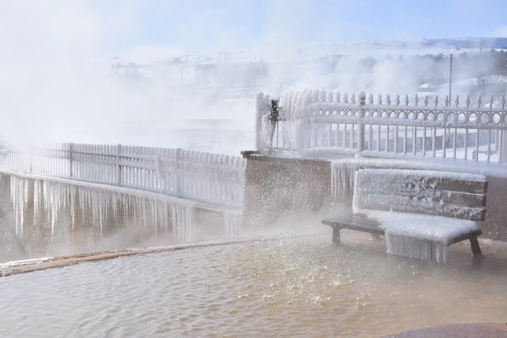 Sivas'ta Pamukkale'ye kardeş olarak yapılan ve sarı renkli travertenleriyle dikkat çeken 'Altınkale'de, sıcak ve soğuk bir arada yaşanıyor. 45 derece sıcaklıktaki termal su, kentteki soğuk havanın etkisiyle borularla travertenlere ulaştırıldığı nokta anında buza dönüşüyor.