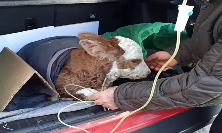 Ardahan’ın Posof ilçesinde rahatsızlanınca sahibi tarafından veterinere getirilen 5 günlük buzağıya otomobilin bagajında serum tedavisi uygulandı. Serumun ardından ayağa kalkan buzağı, sahibini sevindirdi.