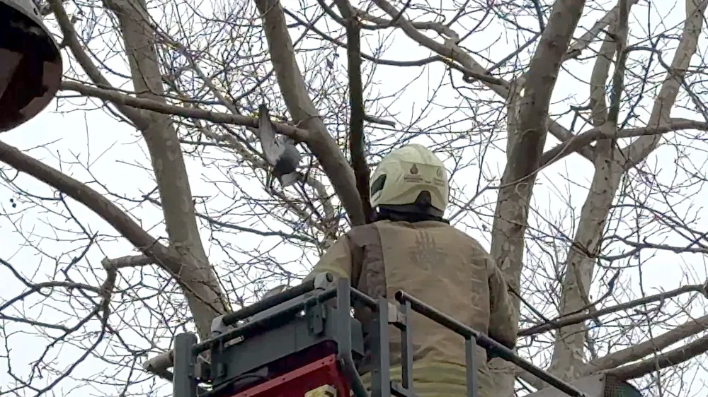 Sepetli araçla ağaca çıkan itfaiye erlerinden biri, mahsur kalan güvercine ulaşarak bir eliyle hayvanı tuttu, diğer eliyle de ayağına dolanan ipi kesti. Kurtarılan güvercin daha sonra serbest bırakıldı.