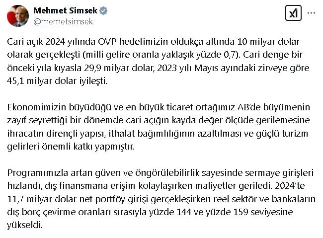 ANKARA, (DHA)- HAZİNE ve Maliye Bakanı Mehmet Şimşek, 2024 yılında cari açığın Orta Vadeli Program (OVP) hedeflerinin oldukça altında gerçekleştiğini açıkladı.