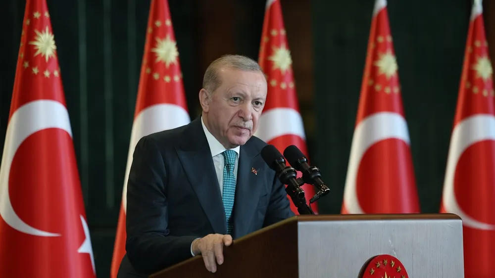Ardından 'Terörsüz Türkiye' sürecine değinen Erdoğan, "Biz derdi olan bu ülkenin, bu milletin derdiyle dertlenen bir kadroyuz. Milletin takdiriyle ülkeyi yönetme görevini devraldığımız günden bu yana 86 milyonun müreffeh ve mutlu geleceği için canla başla çalışıyoruz. Gerek bölgemizde gerekse dünyada risk ve belirsizliklerin dalga dalga yayıldığı kritik bir dönemde iç cephemizi tahkim etmek amacıyla Cumhur İttifakı olarak tarihi bir adım attık. 'Terörsüz Türkiye' sürecini başlatarak milletimizin ayağına vurulan yarım asırlık kanlı prangayı parçalamak üzere sadece elimizi değil gövdemizi de taşın altına koyduk. Süreci sabote etmek isteyen karanlık odaklara rağmen 16 aydır hem büyük bir hassasiyetle hem de müstesna bir başarıyla süreci yönetiyoruz. İlgili kurumlarımız sahadaki görevlerini özenle ve koordinasyon içinde icra etmeyi sürdürüyor. Suriye'nin kuzeyindeki sorunun inşallah suhuletle çözülmesiyle birlikte önümüz daha da açılacaktır. Türkiye olarak bunun gerçekleşmesi için kardeşlik ve komşuluk hukuku çerçevesinde gereken desteği vermeye devam edeceğiz" dedi.