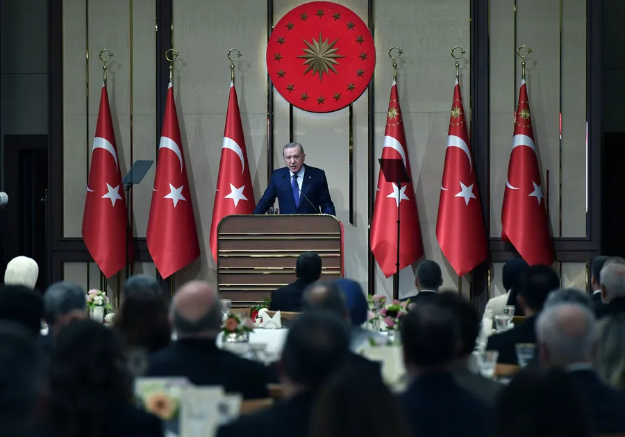 Erdoğan, içinde bulundukları asrı 'Türkiye Yüzyılı' yapmak için incelikle örülmüş, çok boyutlu bir politikayı adım adım hayata geçirdiklerini vurgulayarak, "Bu mücadelede ülkemizin dış ilişkilerinin icrasında merkezi bir konuma sahip olan Hariciye Teşkilatımıza tabiatıyla büyük sorumluluk düşüyor. Ekonomisiyle, ihracatıyla, turizmiyle, savunma sanayisiyle ve elbette uluslararası itibarıyla Türkiye büyüdükçe, Türkiye’nin küresel siyasetteki önemi ve ağırlığı arttıkça, sizin mesainiz de yoğunlaşıyor. Genişleyen diplomatik temsilcilik ağımızla, 264 dış temsilciliğimizle bugün şanlı bayrağımızı dünyanın dört bir yanında gururla dalgalandırıyoruz. Ne eksen kayması ne rota değişimi ne de köklerden kopma; dış siyasetimizde bunların hiçbirisi söz konusu değildir ve olamaz. Çift başlı Selçuklu Kartalı’ndan ilhamı alan bir bakış açısıyla, dünyanın her köşesiyle ekonomik, ticari, diplomatik, siyasi iş birlikleri tesis etmenin, karşılıklı saygıya dayalı samimi ilişkiler geliştirmenin çabasındayız. Özellikle son yıllarda kriz ve çatışmalarla anılan coğrafyamızda, herkesin kazançlı çıkacağı bir barış ve istikrar kuşağı oluşturmanın mücadelesini veriyoruz. Ne yapıyorsak bunun için yapıyoruz" ifadelerini kullandı.