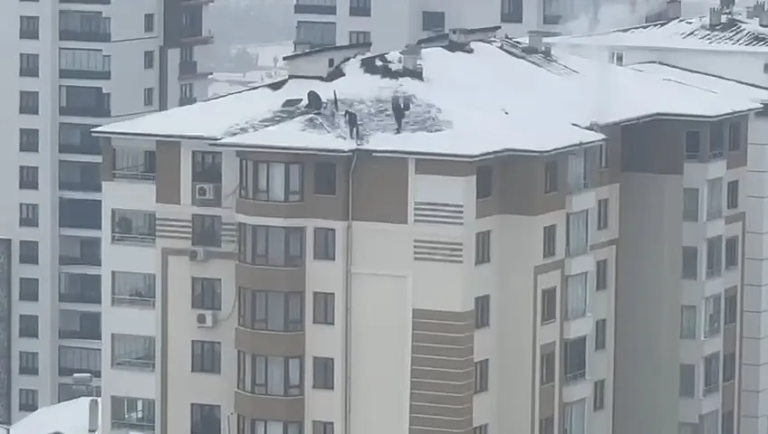 Kentte geçen hafta etkili olan kar yağışının ardından donla birlikte çatılarda biriken kar kütleleri tehlike oluşturmaya başladı. 2 kişinin hiçbir güvenlik önlemi almadan, 10 katlı binanın çatısındaki karı küreklerle temizlediği anlar cep telefonu kamerasıyla kaydedildi.