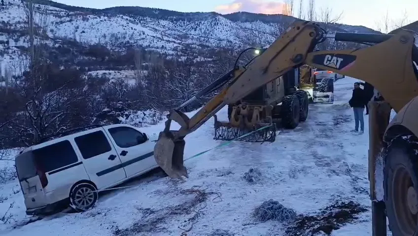 Ekipler, iş makinesiyle yapılan çalışma sonucu aracı bulunduğu yerden kurtararak yolun güvenli hale gelmesini sağladı.