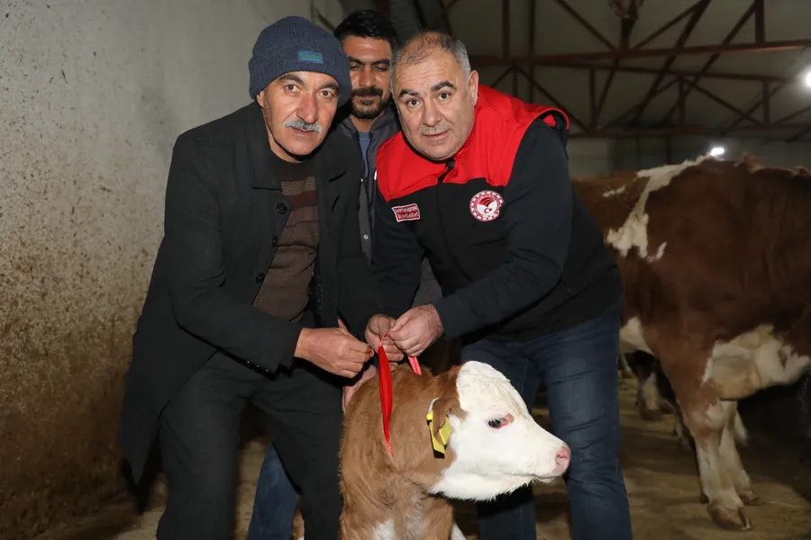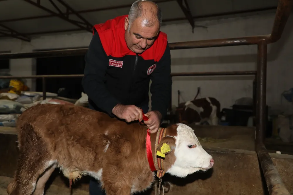 Taşkesen, buzağının sağlıklı ve bereketli bir şekilde büyümesi temennisinde bulunarak çeyrek altın taktı. Buzağıya ‘Bereket’ adının verildiğini söyledi.