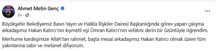 "Büyükşehir Belediyemiz Basın Yayın ve Halkla İlişkiler Dairesi Başkanlığı'nda görev yapan çalışma arkadaşımız Hakan Katırcı’nın kıymetli eşi Ümran Katırcı’nın vefatını derin bir üzüntüyle öğrendim. Merhume kardeşimize Allah’tan rahmet, başta mesai arkadaşımız Hakan Katırcı olmak üzere tüm yakınlarına sabır ve metanet diliyorum."