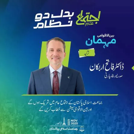 Yeniden Refah Partisi Genel Başkanı Dr. Fatih Erbakan, Pakistan’ın Lahor kentinde düzenlenen Cemaat-i İslami Partisi’nin yıllık Büyük Kongresi’ne katılarak, katılımcılara hitaben bir selamlama konuşması gerçekleştirdi.