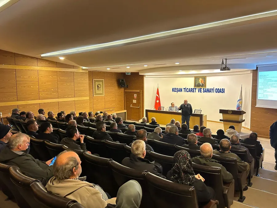 Keşan Ticaret ve Sanayi Odası Konferans Salonu’nda düzenlenen toplantıya, Edirne Tarım ve Orman Müdür Yardımcısı Sezer Seyhan, Keşan Tarım ve Orman Müdürü Olcay Karbuz, İpsala Tarım ve Orman Müdürü Simge Ünlüsoy, Enez Tarım ve Orman Müdürü Murat Aslan, arıcılık faaliyetinde bulunan üreticiler ve teknik personel katıldı. Eğitim programı kapsamında, Prof. Dr. Halil Yeninar tarafından arı yetiştiriciliğinde doğru ve verimli uygulamalar, arı kışlatma teknikleri, arı hastalıklarının tanı ve mücadele yöntemleri ile bal ve diğer arı ürünlerinin üretim süreçlerine ilişkin kapsamlı ve uygulamaya yönelik bilgiler katılımcılara aktarıldı.