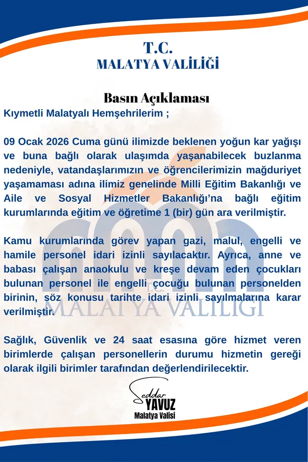 Malatya Valisi Seddar Yavuz, meteorolojik değerlendirmeler doğrultusunda il genelinde etkili olması beklenen yoğun kar yağışı ve buna bağlı ulaşımda yaşanabilecek buzlanma riskine karşı tedbir alındığını duyurdu. Alınan karar kapsamında, 9 Ocak 2026 Cuma günü Milli Eğitim Bakanlığı ile Aile ve Sosyal Hizmetler Bakanlığı’na bağlı tüm eğitim kurumlarında eğitim ve öğretime bir gün süreyle ara verildi.