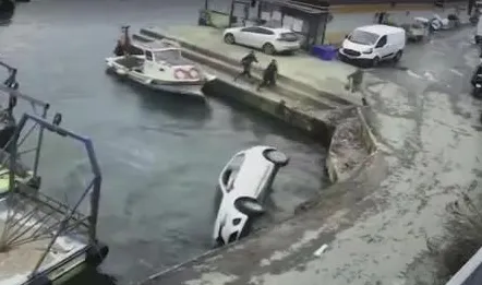 Sarıyer'de sürücüsünün direksiyon hakimiyetini kaybettiği otomobil, balıkçı barınağındaki mendirekten denize düştü. Kazayı gören hareket halindeki balıkçı teknesindeki kişi denize atlayıp yüzerek yardım için aracın yanına geldi. Yara almadan kazayı atlatan sürücü çevredekilerin yardımıyla araçtan çıkarıldı. Kaza anı güvenlik kamerasına yansıdı.