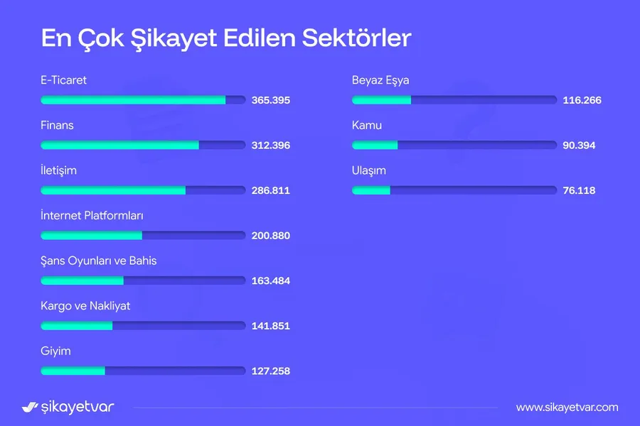 Şikayetvar tarafından açıklanan verilere göre e-ticaret sektörü 365 bin 395 şikayet sayısıyla tüketicilerin en çok çözüm beklediği sektör oldu. 2. sırada 312 bin 396 şikayet sayısıyla finans sektörü olurken, iletişim sektörü 286 bin 811 sayısıyla 3. sırada yer aldı. İnternet platformları (200 bin 880), şans oyunları ve bahis (163 bin 484), kargo ve nakliyat (141 bin 851), giyim (127 bin 258), beyaz eşya (116 bin 266), kamu (90 bin 394) ve ulaşım sektörü en çok şikayet edilen sektörler olarak sıralamada yerini aldı.