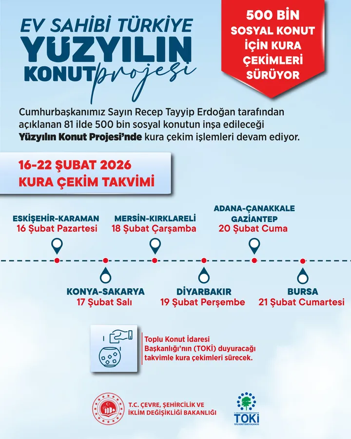 16-22 Şubat haftası takvimine göre; 16 Şubat Pazartesi Eskişehir’de 6 bin 55, Karaman’da 1550, 17 Şubat Salı Konya’da 15 bin 200, Sakarya’da 6 bin 633, 18 Şubat Çarşamba Mersin’de 8 bin 190, Kırklareli’nde 2 bin 255, 19 Şubat Perşembe Diyarbakır’da 12 bin 165, 20 Şubat Cuma Adana’da 12 bin 400, Çanakkale’de 3 bin 276, Gaziantep’te 13 bin 890, 21 Şubat Cumartesi Bursa’da 17 bin 225 konutun daha hak sahipleri belirlenecek. Böylece 16-22 Şubat 2026 haftasında 11 ilde toplam 98 bin 839 konutun daha kurası çekilecek. 22 Şubat’ta kurası çekilen il sayısı 69’a hak sahibi belirlenen konut sayısı ise 312 bin 290’a yükselecek.