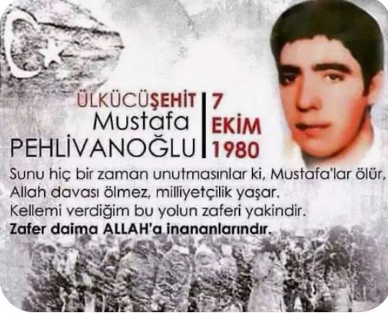 12 Eylül Cuntası tarafından 7 EKİM 1980 de idam edilen ülküdaşım MUSTAFA PEHLİVANOĞLU’nu şehadetinin yıldönümünde rahmetle,katillerini lanetle ve nefretle anıyorum!..