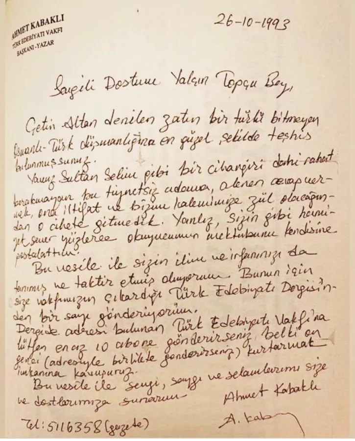 26 EKİM 1993’te bir mevzu hususunda bizzat kaleme alarak şahsıma gönderdiği yol gösteren mektubundaki  buyurgan olmayan,uyarıcı ama kırıcı olmayan,milli ve manevi hassasiyetleri önceleyen üslubu,KABAKLI HOCA’nın kalemiyle olduğu kadar şahsi temaslarıyla da bir “ İRFAN MEKTEBİ ” olduğunun kanımca çok açık delilidir.