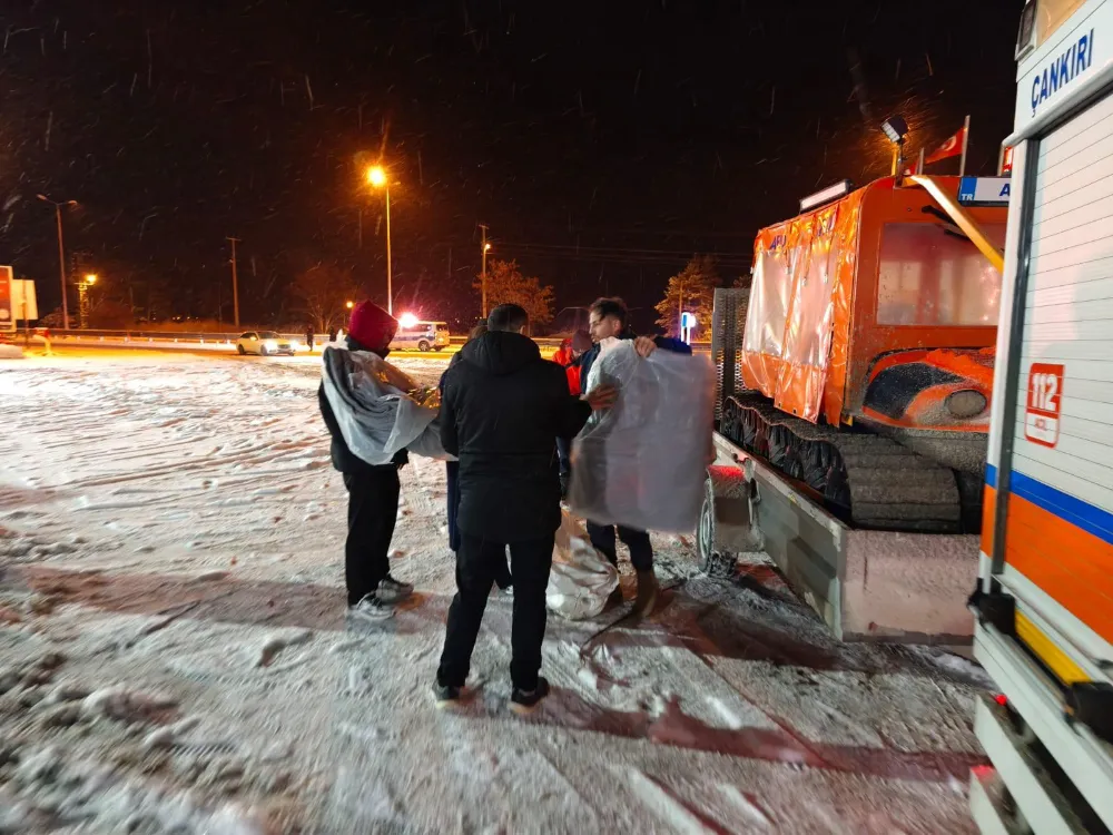 Kar yağışının yoğunlaşması nedeniyle ulaşıma kapanan Bolu/Gerede-Karabük-Çankırı/Çerkeş yollarında, Karayolları Genel Müdürlüğü ekiplerince yol açma çalışmaları aralıksız sürdürülürken, yolda kalan vatandaşlarımıza AFAD ve Kızılay ekiplerimiz tarafından gerekli destekler sağlanmaktadır. Bu kapsamda AFAD tarafından 178 personel ve 47 araç, Türk Kızılay tarafından ise 16 personel ve 4 araç, Bolu-Gerede, Karabük ve Çankırı-Çerkez'de sahada görev yapmaktadır. Yolda mahsur kalan vatandaşlarımıza 782 kumanya ve 600 battaniye yardımı yapılmıştır. Vatandaşlarımızın, başta buzlanma ve don olayına bağlı ulaşımda aksamalar ile yerde kar örtüsü olan yüksek ve eğimli alanlarda çığ riski gibi olumsuzluklara karşı dikkatli ve tedbirli olmalarını; yetkili mercilerin uyarılarını dikkate almalarını önemle hatırlatıyoruz. Gelişmeler takip edilmektedir" ifadelerine yer verildi.