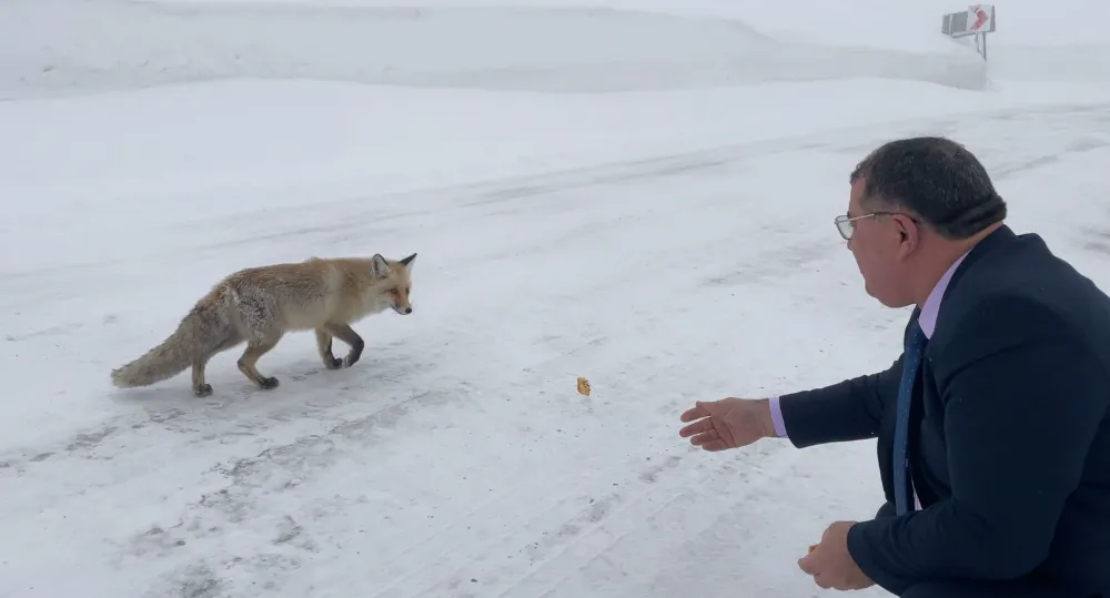 Artvin’de Şavşat Belediye Başkanı Durmuş Aydın, kar yağışının etkili olduğu Sahara Geçidi’nde yiyecek arayan tilkiyi, yanına yaklaşarak elleriyle besledi. Aydın’ın, tilkiye ekmek verdiği o anlar görüntülendi.