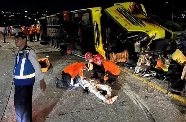 Endonezyalı yetkililer, başkent Cakarta'dan Yogyakarta yönüne giden otobüsün, gece yarısı Orta Java eyaletine bağlı Semarang kentindeki Krapyak gişeleri yakınlarında kontrolden çıkarak beton bariyere çarptığını belirtti.