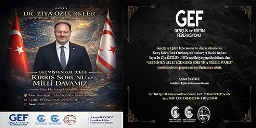 Kuzey Kıbrıs Türk Cumhuriyeti Cumhuriyet Meclisi Başkanı Dr. Ziya Öztürkler’in katılımlarıyla gerçekleştirilecek konferansta, Kıbrıs meselesinin tarihsel süreci ve güncel gelişmeleri ele alınacak.Gençlik ve Eğitim Federasyon Başkanı Ahmet Bayduz tarafından düzenlenecek olan “Geçmişten Geleceğe Kıbrıs Sorunu ve Millî Davamız” konulu konferans, 29 Ocak 2026 Perşembe günü şehrimizde gerçekleştirilecek.