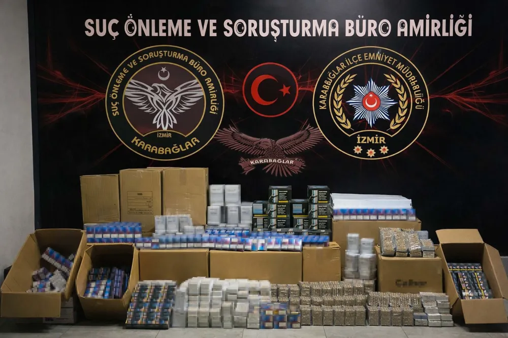 İzmir Emniyet Müdürlüğü Karabağlar İlçe Emniyet Müdürlüğü Suç Önleme ve Soruşturma Büro Amirliğine bağlı ekipler, bir adreste bandrolsüz sigara ve uyuşturucu bulunduğu bilgisi üzerine harekete geçti. Adrese düzenlenen operasyonda 500 bin dal doldurulmuş makaron, bin 620 bandrolsüz sigara, 273 uyuşturucu hap ele ve 71 fişek ele geçirildi.